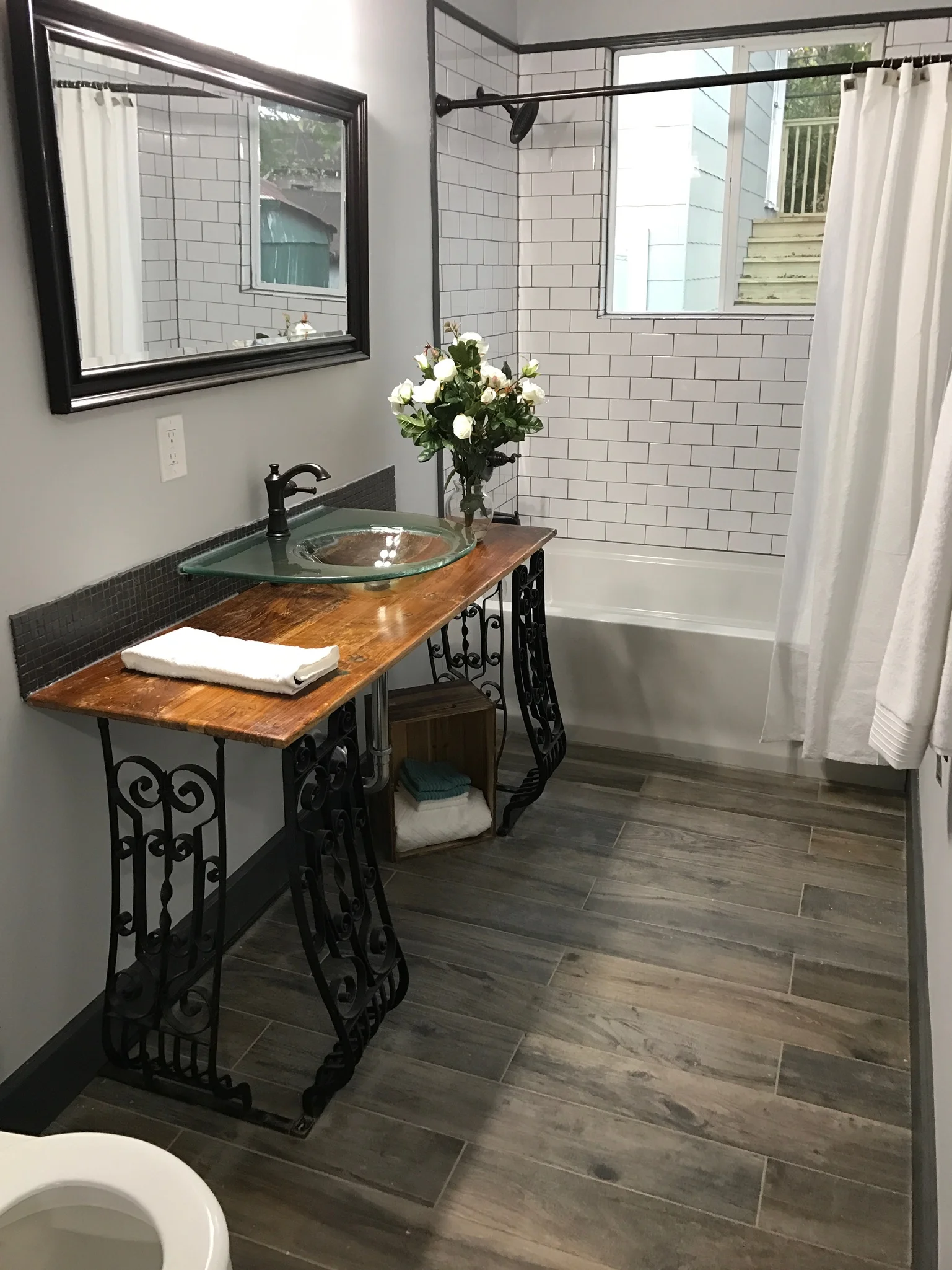 The vanity was a table I found at an import store in Houston. The iron decorative pieces are off an old porch rail. We added a free floating sink that we found at Habitat for Humanity. The floors are tile and the towel bar is iron gas plumbing.